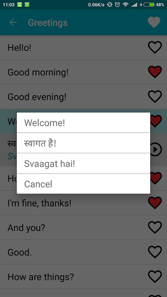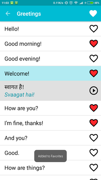 Learn Hindi è un'applicazione educativa progettata per facilitare l'apprendimento della lingua hindi. Rivolta sia ai principianti che agli utenti avanzati, offre strumenti utili per chi desidera viaggiare in India. Tra le sue funzionalità principali, spiccano traduzioni di alta qualità fornite da parlanti nativi indiani, che garantiscono accuratezza e autenticità nel processo di apprendimento. Inoltre, l'app consente di creare una lista dei preferiti, rendendo semplice rivedere le parole e le frasi più importanti.